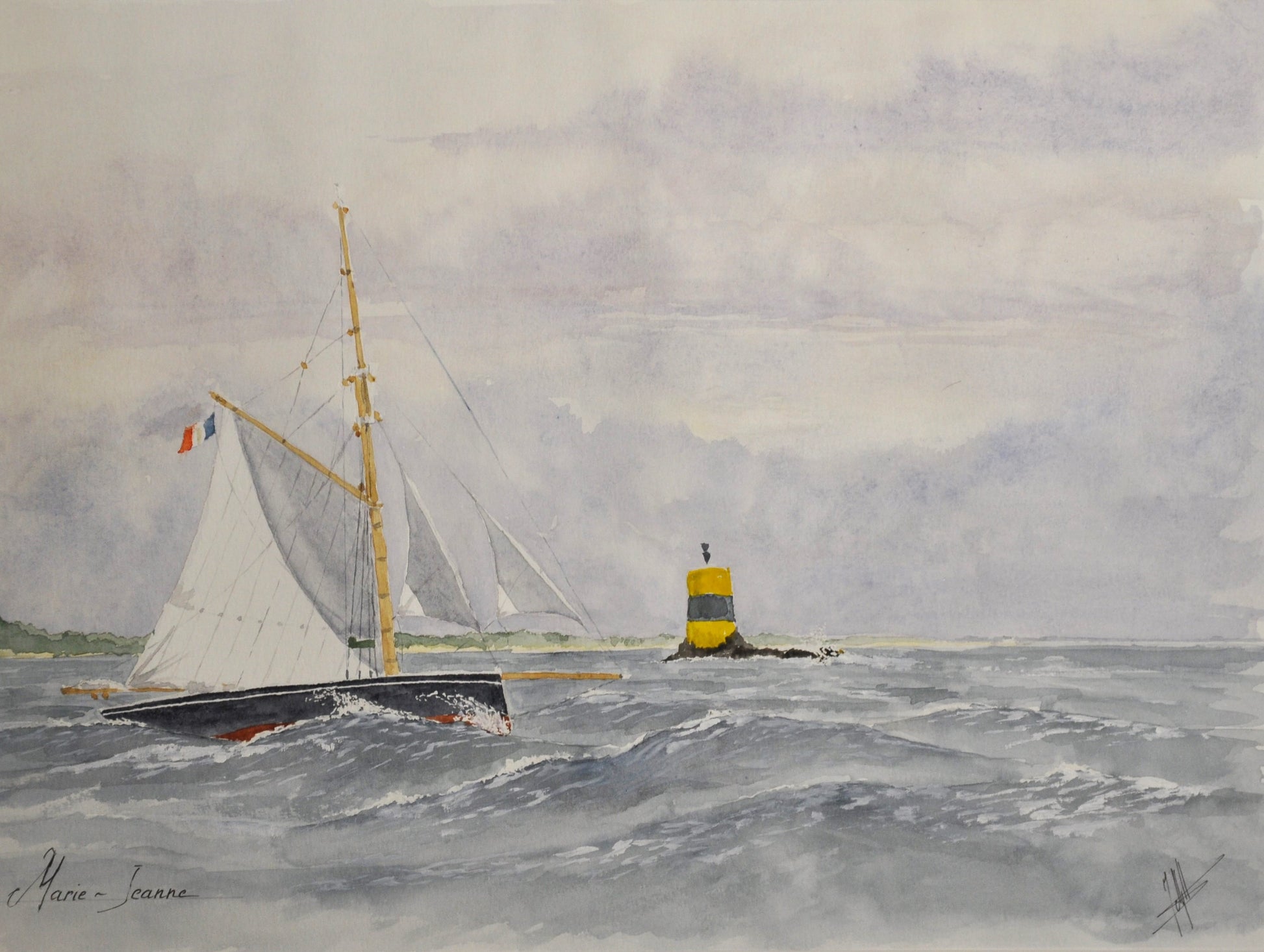 "La Marie-Jeanne au près passant une balise Sud" – Aquarelle originale par Jean-Christophe Lucas