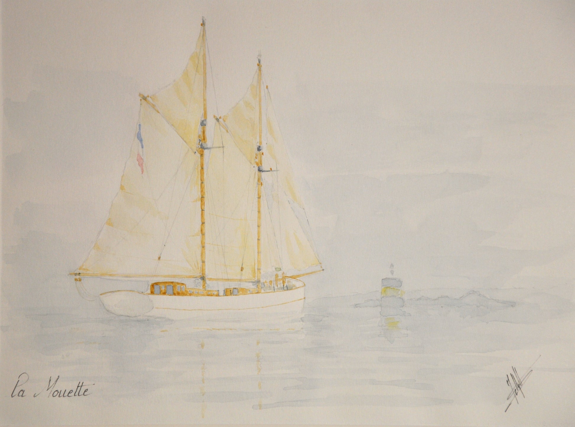 aquarelle Cette capture l'instant magique où le bateau "La Mouette" semble suspendu dans une mer d'huile, pris dans une brume légère sous une chaleur estivale écrasante.