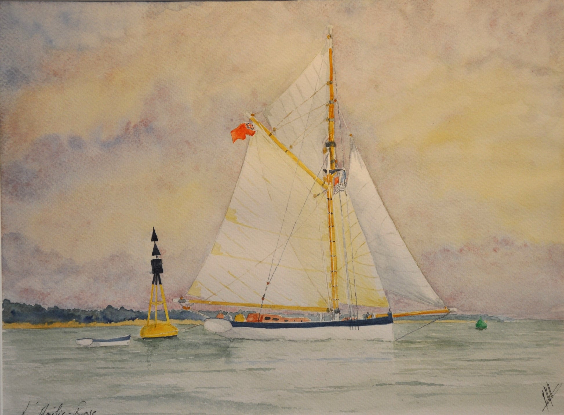 Cette aquarelle capture l'élégance intemporelle de l'Amélie-Rose, un voilier traditionnel évoluant sur une mer calme aux premières lueurs du matin.
