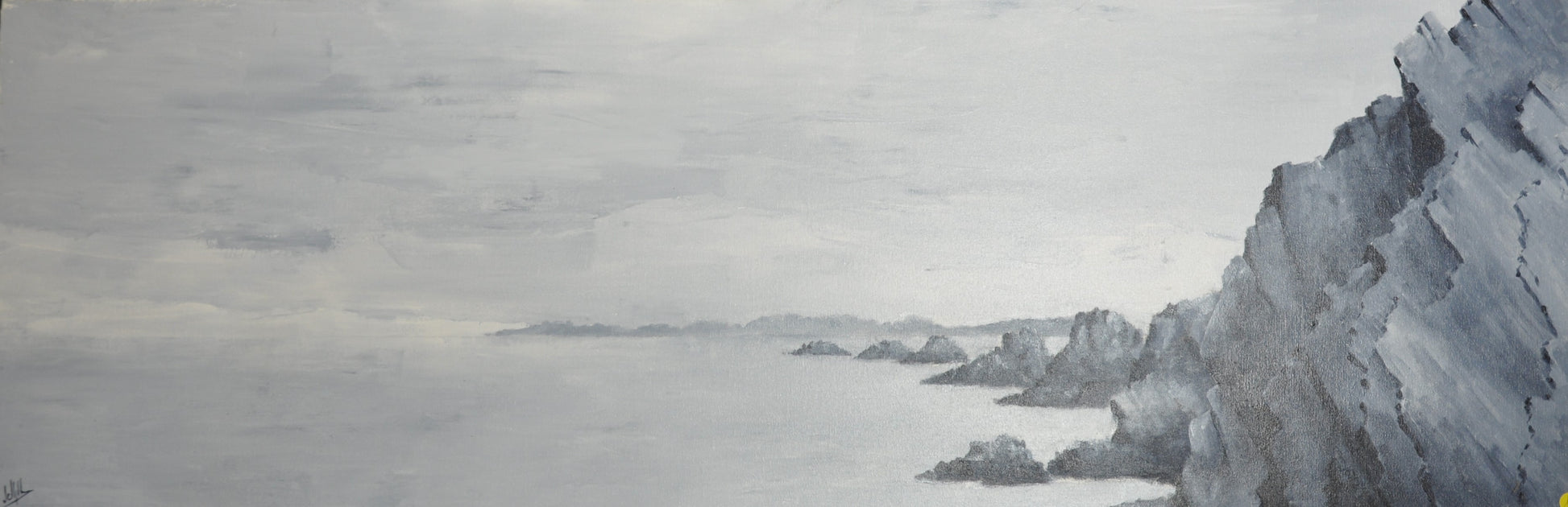 Cette œuvre monochrome nous plonge dans un paysage marin envoûtant, où les roches abruptes rencontrent une mer brumeuse. L’artiste joue avec les contrastes subtils pour capturer l’essence brute et intemporelle du littoral breton.