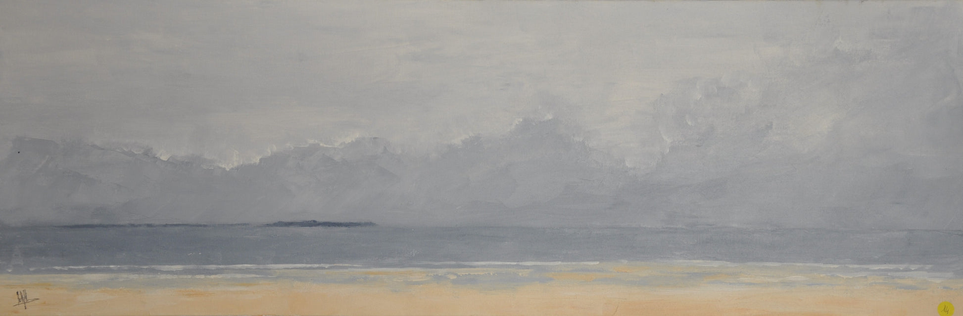 Les nuances douces de bleu-gris et de sable pâle évoquent le calme d’une mer d’hiver, un horizon lointain à la fois apaisant et mystérieux. L’application délicate de la peinture laisse place à l’imagination et à l’émotion.